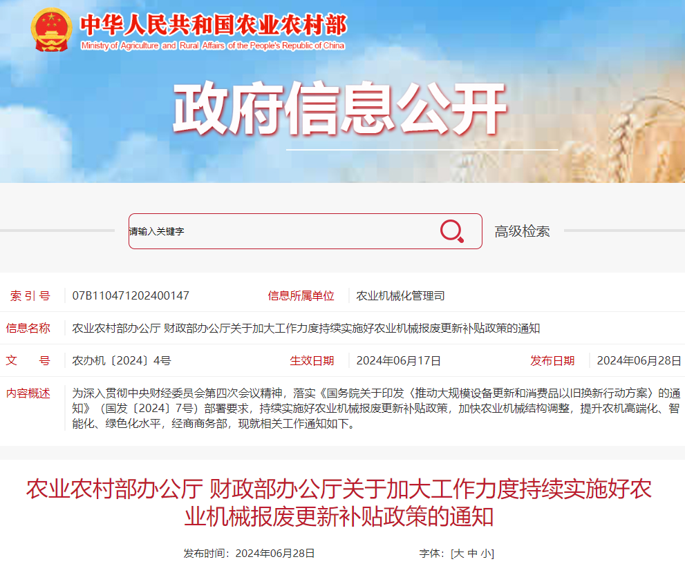 了解更多農業(yè)農村部等部門關于加大工作力度持續(xù)實施好農業(yè)機械報廢更新補貼政策的通知(最高可領3萬元)