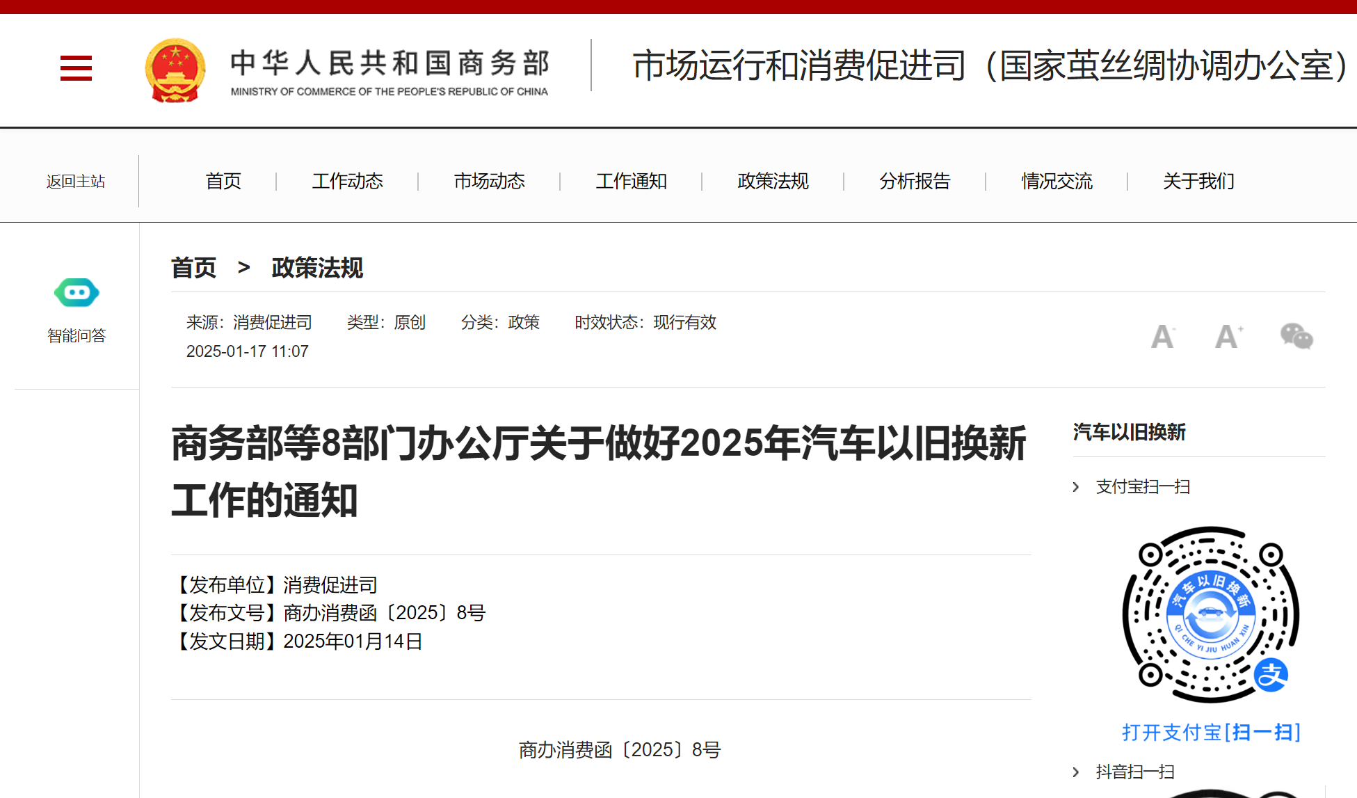 了解更多商務(wù)部等8部門辦公廳關(guān)于做好2025年汽車以舊換新工作的通知