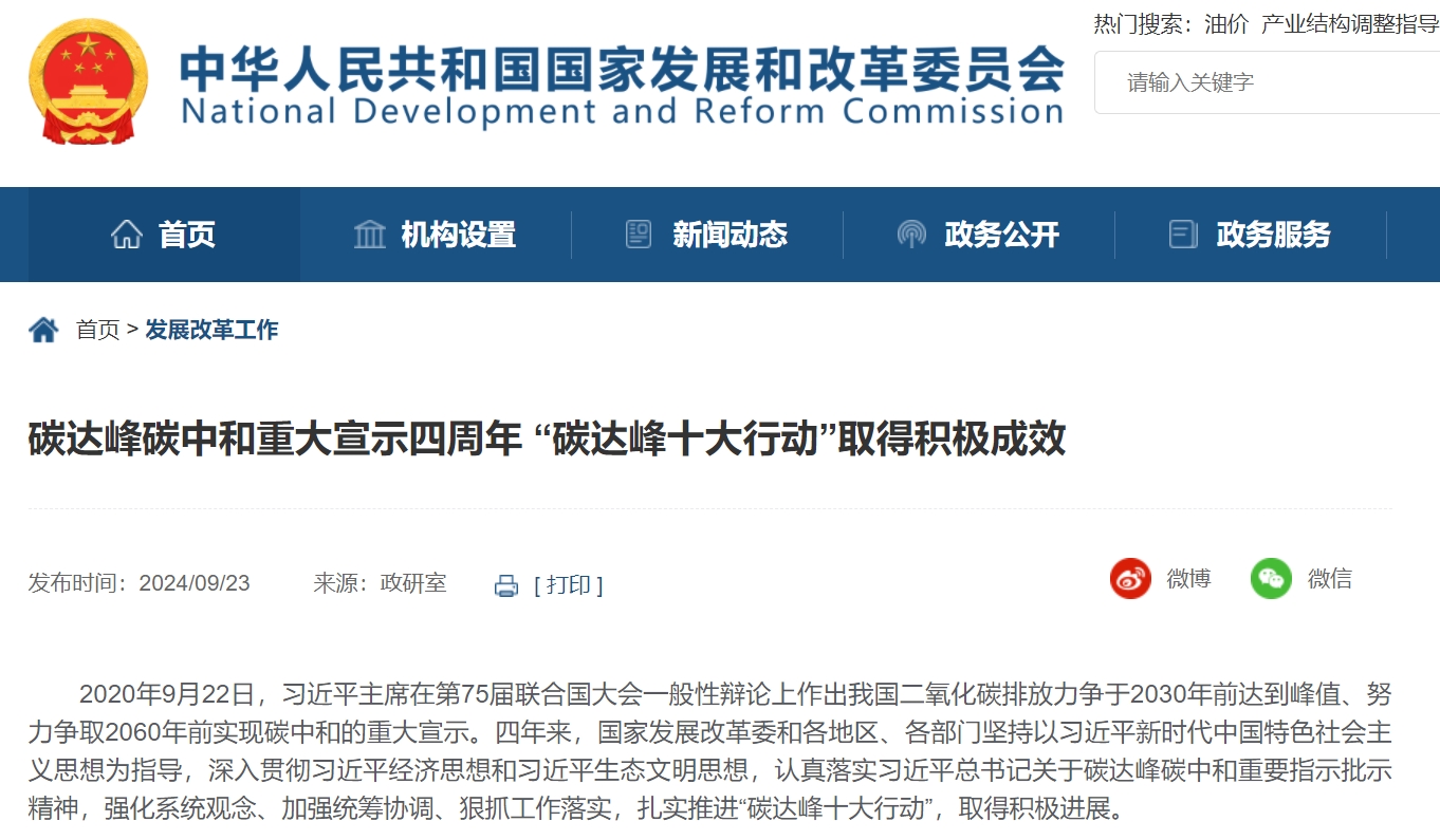 碳達峰碳中和重大宣示四周年“碳達峰十大行動”取得積極成效