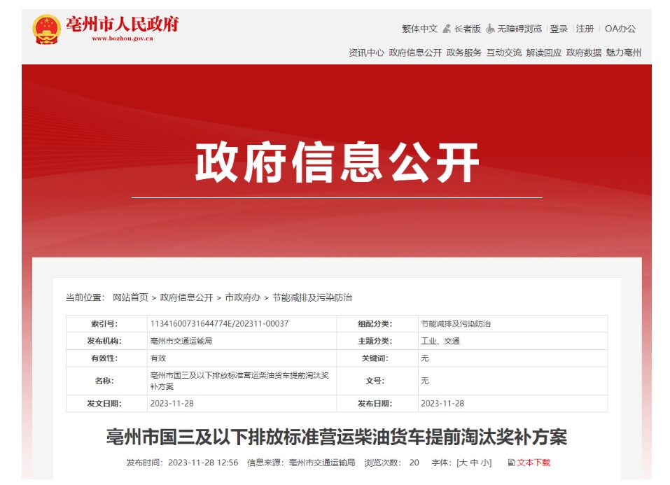 了解更多安徽省亳州市國三及以下排放標準營運柴油貨車提前淘汰獎補方案
