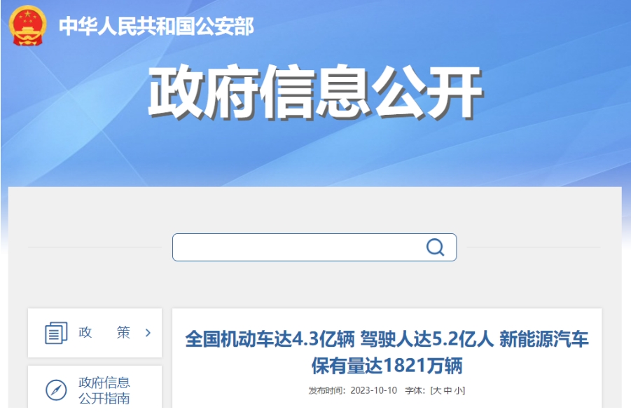 了解更多公安部:截至2023年9月底全國機動車達4.3億輛新能源汽車保有量達1821萬輛