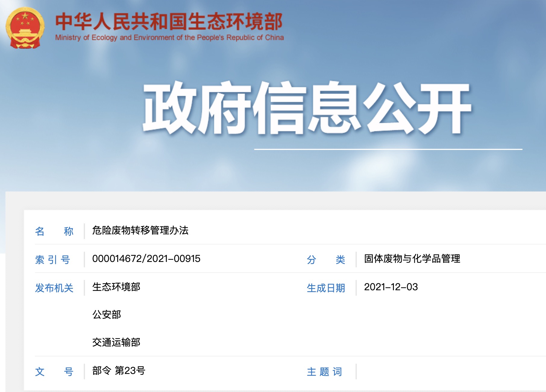 了解更多《危險廢物轉(zhuǎn)移管理辦法》已于2021年9月18日由生態(tài)環(huán)境部部務(wù)會議審議通過,并經(jīng)公安部和交通運輸部同意,現(xiàn)予公布,自2022年1月1日起施行。