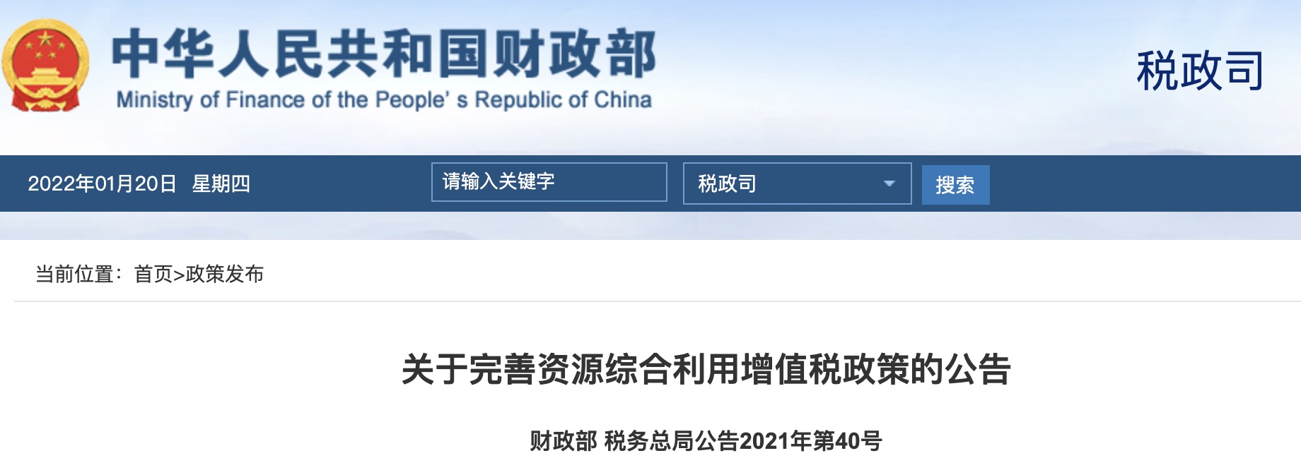 了解更多關(guān)于完善資源綜合利用增值稅政策的公告財政部稅務(wù)總局公告2021年第40號為推動資源綜合利用行業(yè)持續(xù)健康發(fā)展,現(xiàn)將有關(guān)增值稅政策公告如下:一、從事再生資源回收的增...