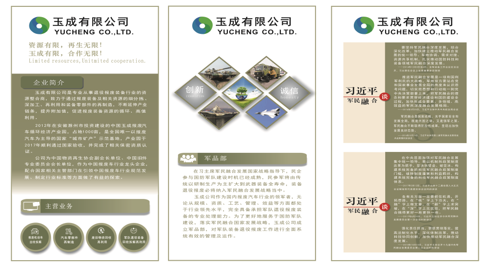 軍品部成立以來,以突出軍民融合、循環(huán)再生、綠色環(huán)保、可持續(xù)發(fā)展等特色,及時跟蹤了解退役裝備進展情況,先后進行黨建氛圍營造,軍品部宣傳手冊、退役裝備處理方案研究等系列準備工作。